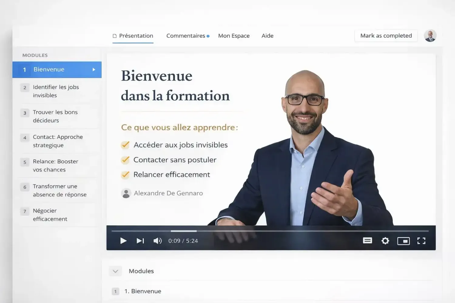 7 modules pour passer de "candidat invisible" à "chasseur d'opportunités". Chaque vidéo est conçu pour être mis en pratique dès le visionnage.